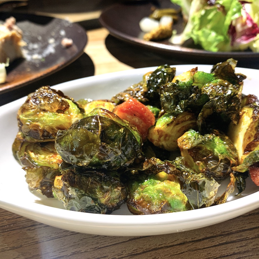 。「楓糖孢子甘藍」油炸過後火炒悶熟並伴入楓糖,入口軟嫩油香、糖香、菜甜三者相得益彰,我也常在家裡做孢子甘藍,但將簡單的食材做得如此美味可口讓我們馬上加點了一盤❤️